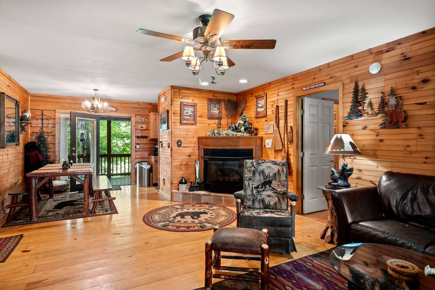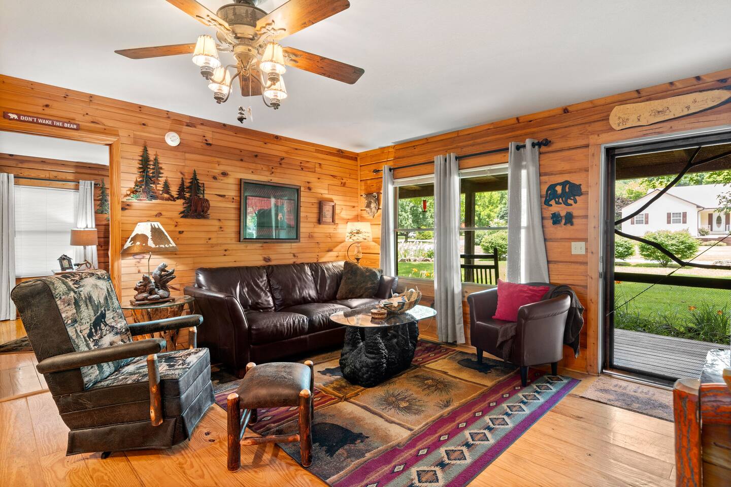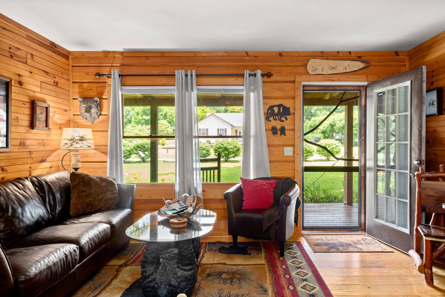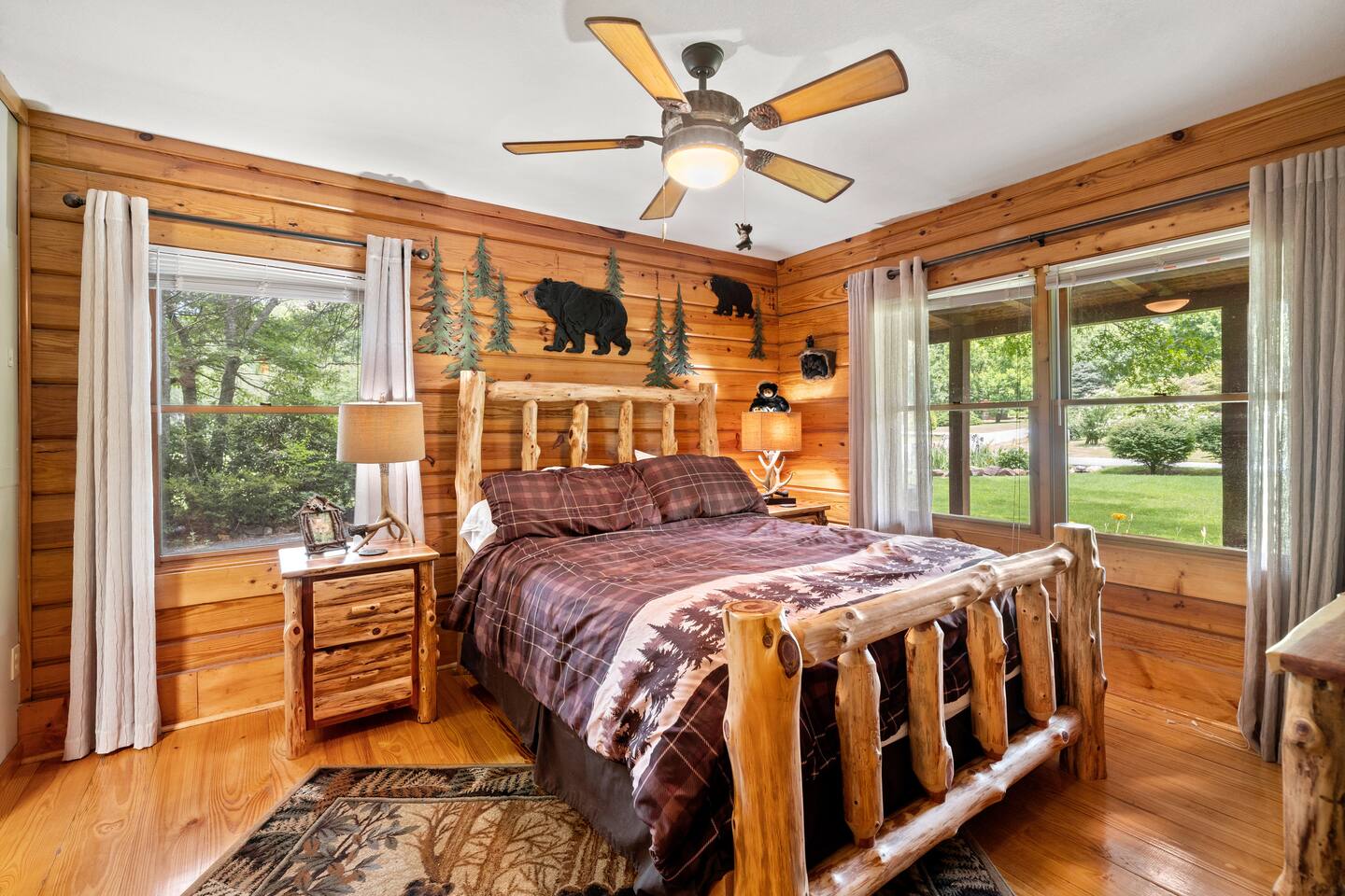 You'll love the details of this rustic, yet modern cabin. The deck overlooking the creek is a great spot to relax at night!! In the primary bedroom suite, we have a Queen size bed, the second bedroom has a Queen bed, and the third has a Full/Twin bunk bed.